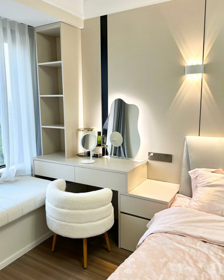 飄窗梳妝臺一體設計:將梳妝臺延伸到飄窗,可以實現很多姐妹即想滿足大床頭柜以及衣柜和梳妝臺同時存在的需求。