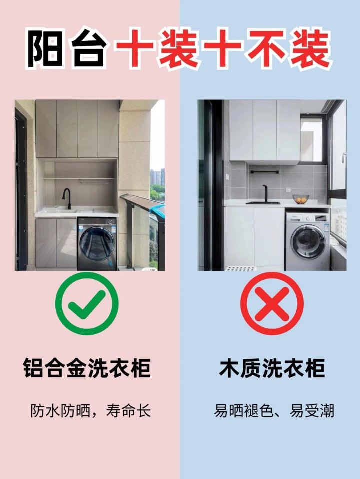 鋁合金洗衣柜具有較好的耐候性和耐用性,不易受潮濕影響,適合陽臺這種半戶外空間。木質洗衣柜雖然外觀溫馨,但容易受潮、變形,不適合長期暴露在陽臺環境中。