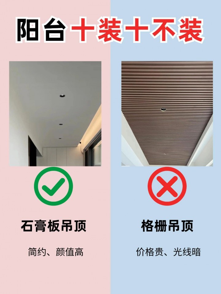 石膏板吊頂簡潔大方,易于安裝和維護,適合陽臺這種需要簡單裝飾的空間。格柵吊頂雖然可以增加空間層次感,但清潔難度大,且在陽臺這種容易積灰的環境中,容易顯得雜亂。