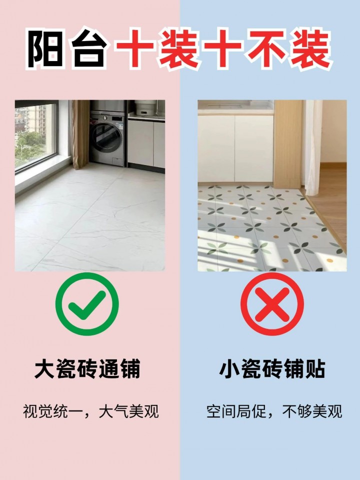 大瓷磚通鋪可以減少拼接縫隙,降低清潔難度,同時視覺效果更加統一和大氣。小瓷磚鋪貼雖然可以增加細節感,但會增加清潔工作量,且在陽臺這種容易積水的地方,縫隙容易藏污納垢。