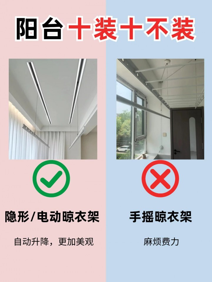 隱形或電動晾衣架不僅節省空間,使用起來也更加方便,可以提升陽臺的使用效率。手搖晾衣架雖然成本較低,但使用起來較為繁瑣,且占用空間較大。