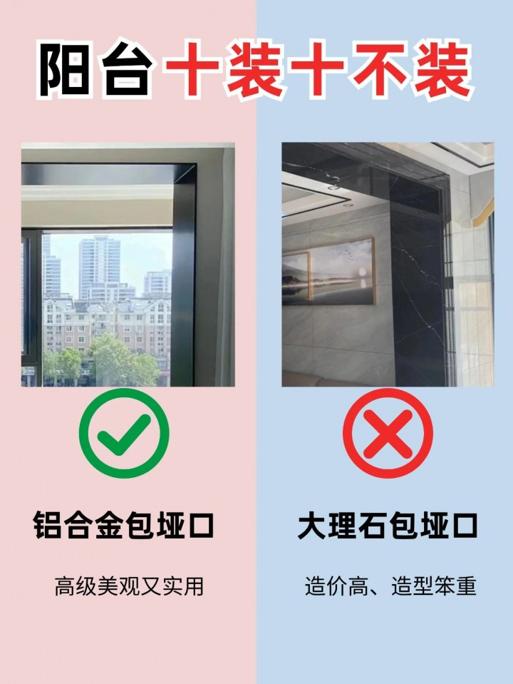 鋁合金材質輕便、耐腐蝕,適合用于陽臺埡口的裝飾。大理石雖然質感高貴,但重量大,安裝成本高,且在陽臺這種半戶外環境中容易受潮、變色。