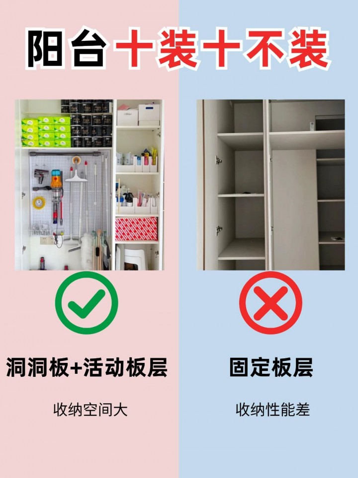 洞洞板和活動板層可以根據需要靈活調整,增加儲物空間的同時,也能保持陽臺的整潔。固定板層雖然可以提供固定的儲物空間,但靈活性較差,不易適應不同家庭的需求。