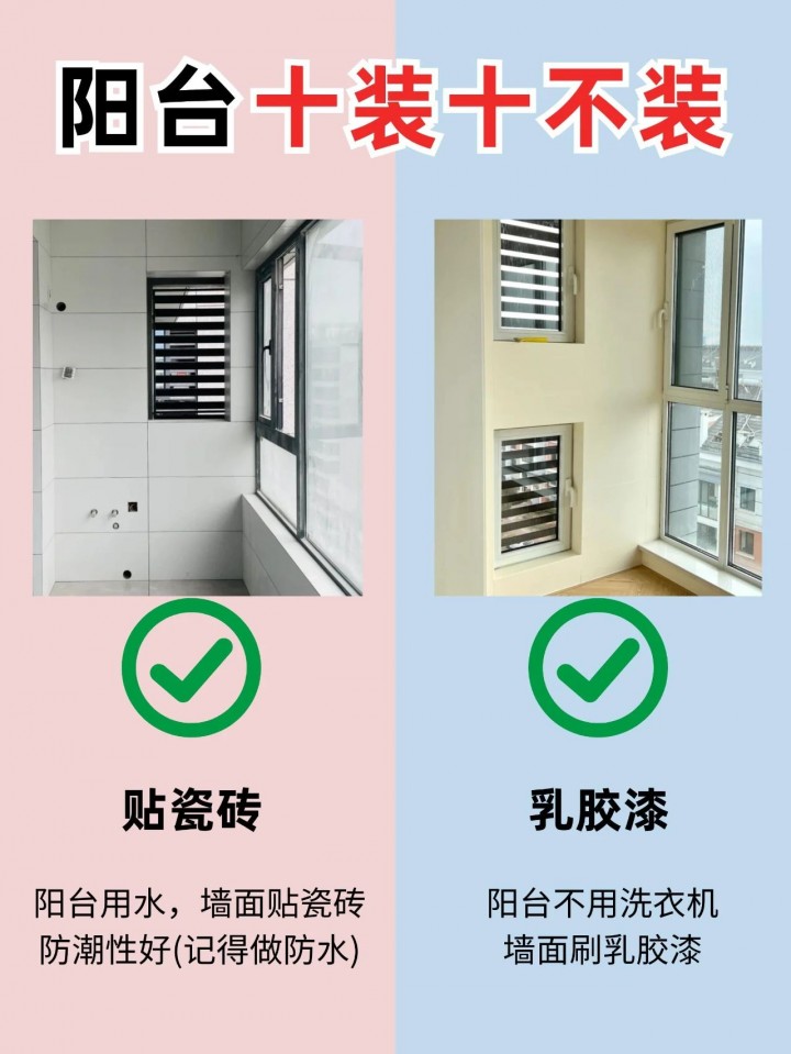 乳膠漆墻面易于清潔,維護簡單,且顏色和質感選擇多樣,可以更好地融入室內裝修風格。而瓷磚墻面雖然耐用,但在陽臺這種容易受潮的環境中,容易脫落,且安裝成本較高。