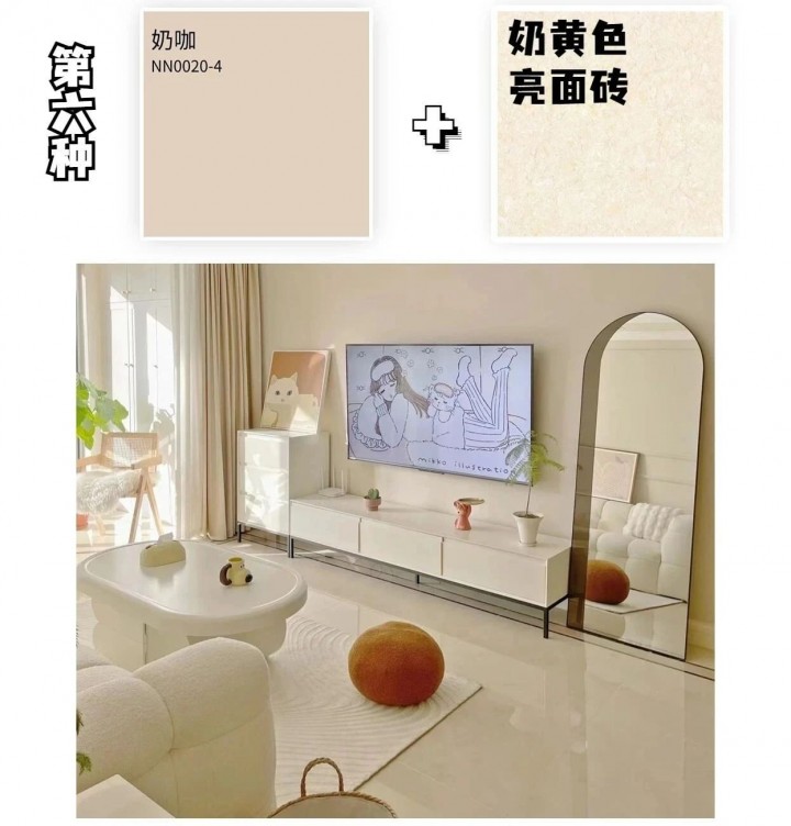 奶油色的柔光磚以其柔和的色澤和溫潤的質(zhì)感,給人一種溫馨舒適的感覺。當它與珍珠白的乳膠漆相結合時,整個空間仿佛被一層溫暖的陽光包圍。珍珠白的光澤與奶油色的柔和相得益彰,為家居空間增添了一抹溫馨與寧靜。這種配色方案適合臥室或兒童房,能夠營造出一個放松和安心的休息環(huán)境。