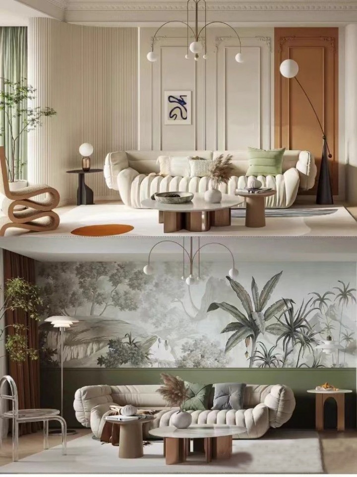 從設計方案上說,墻布和乳膠漆要根據風格需求,造型需求來選擇,比如說中式風格,歐式風格和美式風格,墻布比乳膠漆就更合適。而像北歐風格和現(xiàn)代風格則大部分都是用的乳膠漆。另外造型上也要考慮墻布與不同材質之間的收口。