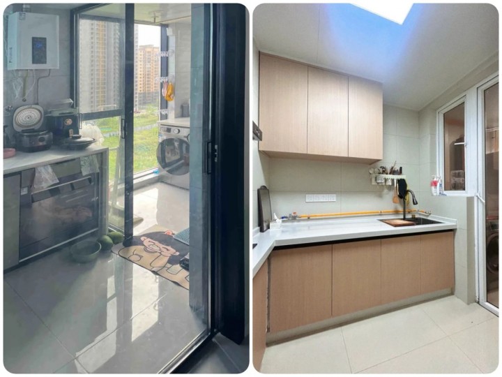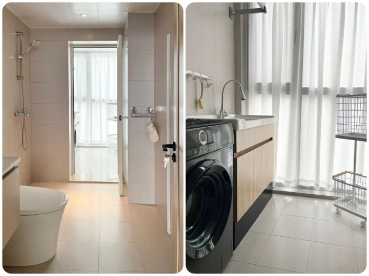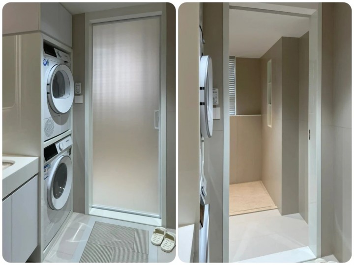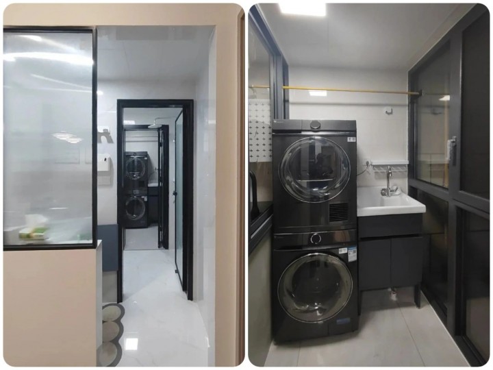 ▲小型生活陽臺與衛(wèi)生間的打通設計,洗烘套裝外置兼顧衛(wèi)生間使用,功能保持不變,但空間和光線更加通透。