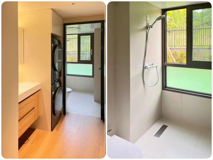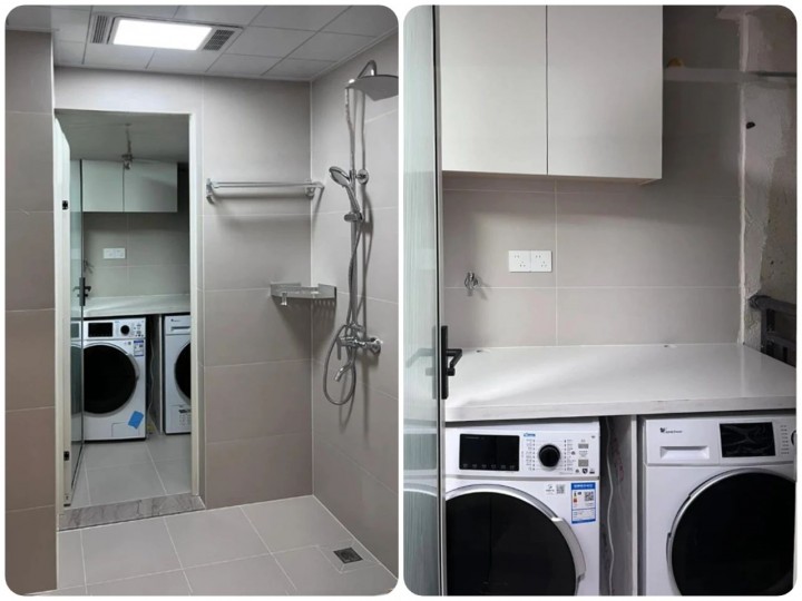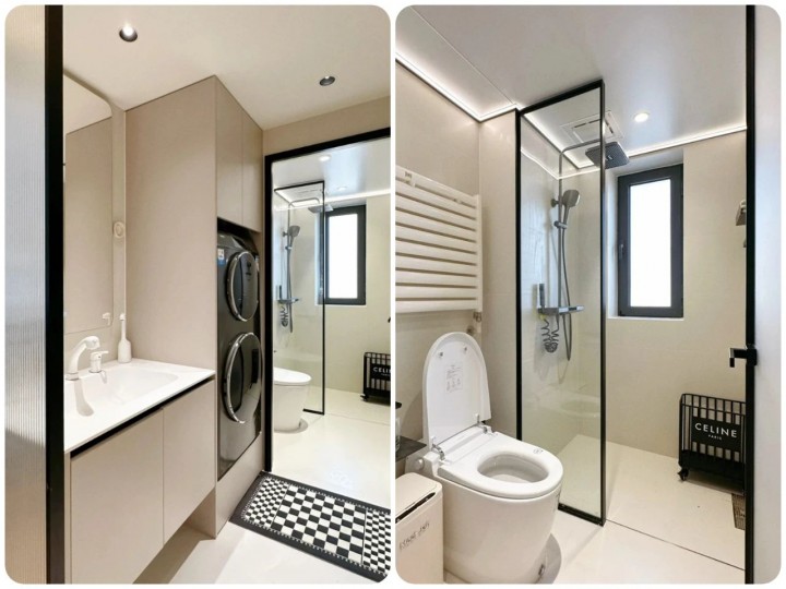 ▲衛(wèi)生間與陽臺打通后重新分割,干區(qū)的洗烘機和浴柜外置,原有陽臺位置設置花灑和馬桶,優(yōu)勢在于洗衣時無需穿過淋浴房,提升了功能使用的便利性。