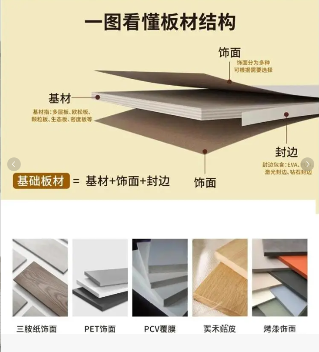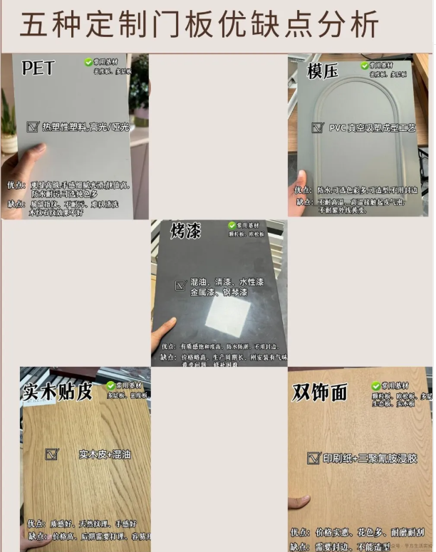 5.PET膜 PET作為一種食品級環(huán)保材料(常用于礦泉水瓶),將其制成門板表面材料,可分為高光(光澤度≥95°)和啞光(膚感)兩種效果。 膚感PET門板觸感猶如嬰兒肌膚,而高光PET則具有出色的反光效果,能讓小空間顯得通透。市場價格較高,但耐刮性能出眾(硬度可達(dá)3H)。需注意啞光表面油污應(yīng)及時用專用清潔劑處理,避免留下痕跡。 選購決策指南 1. 預(yù)算優(yōu)先:選擇雙飾面或吸塑門板 2. 風(fēng)格需求:歐式選吸塑,現(xiàn)代選PET或烤漆,中式選實木貼皮 3. 性能考量:潮濕環(huán)境選烤漆或吸塑,高溫區(qū)域避開PET 4. 環(huán)保標(biāo)準(zhǔn):查看檢測報告,確定環(huán)保等級
