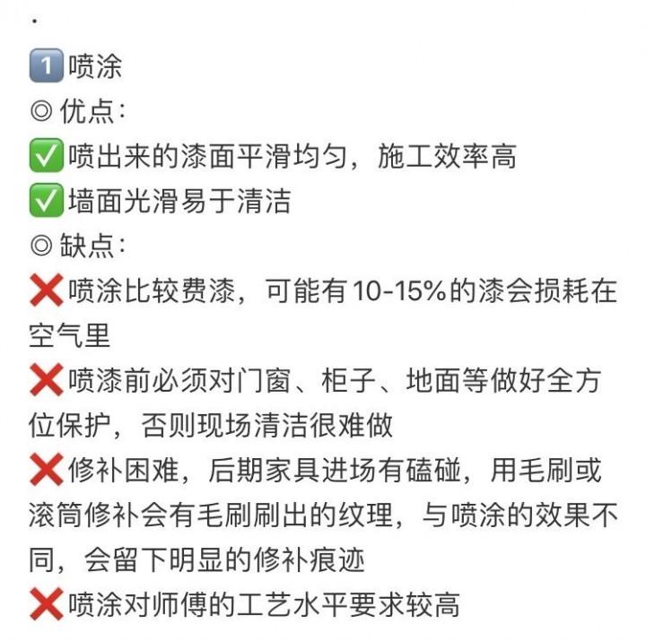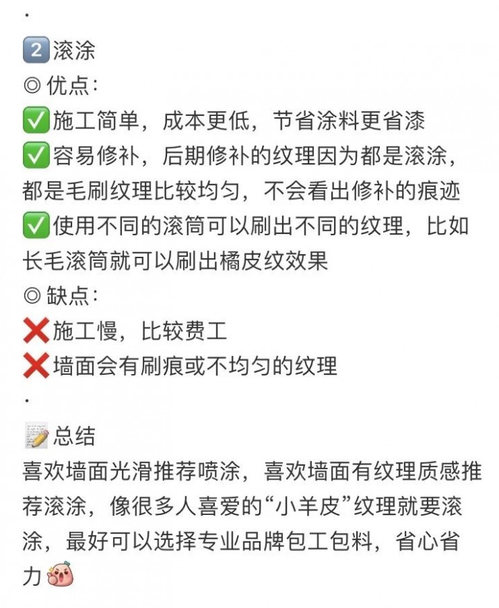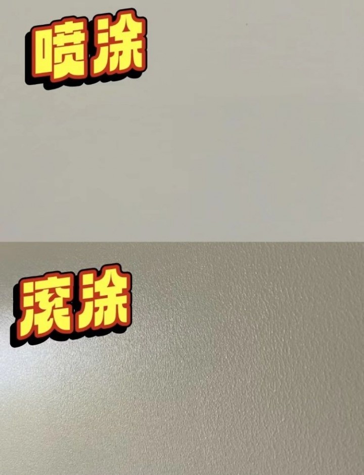 墻面則選滾涂,因為后期難免有磕碰需要修補,噴涂的墻面修補后會有明顯痕跡,滾涂的修補痕跡相對不明顯。當然,你也可以根據自己的實際需求選擇,附上兩者的優缺點供參考: