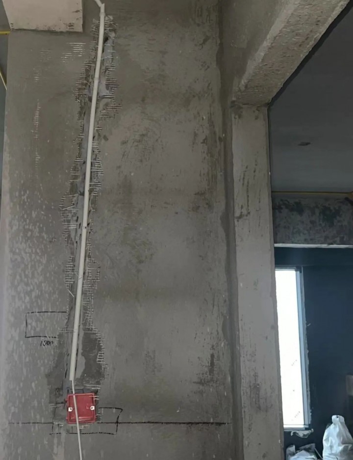 后來風(fēng)管機(jī)安裝師傅只能重新開槽(有些師傅會收額外費(fèi)用),預(yù)埋的底盒還歪了。直到裝面板時業(yè)主才發(fā)現(xiàn),好好的墻面留了個瑕疵。