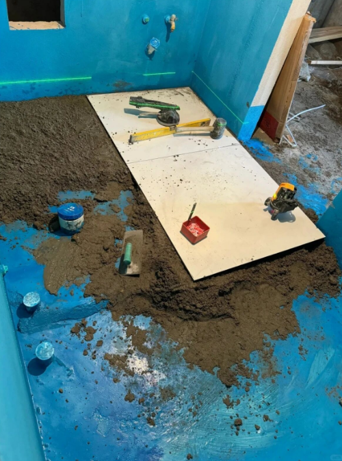 衛生間地面常見貼磚方法,也叫“干鋪法”,流程是1:3比例水泥與中砂攪拌總厚度約5-8cm,水泥砂漿層表面澆水泥漿輔助粘合,實現鋪貼。 優點是鋪貼方便快捷成本低,缺點是水泥砂漿層會吸水,平時淋浴的水都會通過縫隙流入,時間長難免有異味,同時潮氣也有可能順著墻面而上,進而影響輕體另一面的油漆。