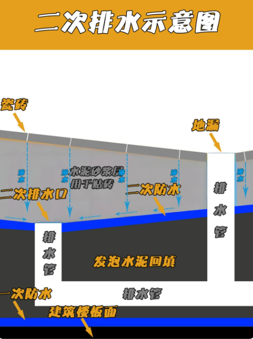 下圖為衛生間二排示意圖,二次排水(暗排)就在水泥砂漿層下方,瓷磚下的砂漿層吸飽水后,多余的水才會流進二次排水;此處就會出現一個問題,大量的水淤積在水泥砂漿層中,可能會有異味;雖然不會漏到樓下,但瓷磚下方會常年潮濕,可能影響相鄰的油漆墻面,導致返潮起堿。
