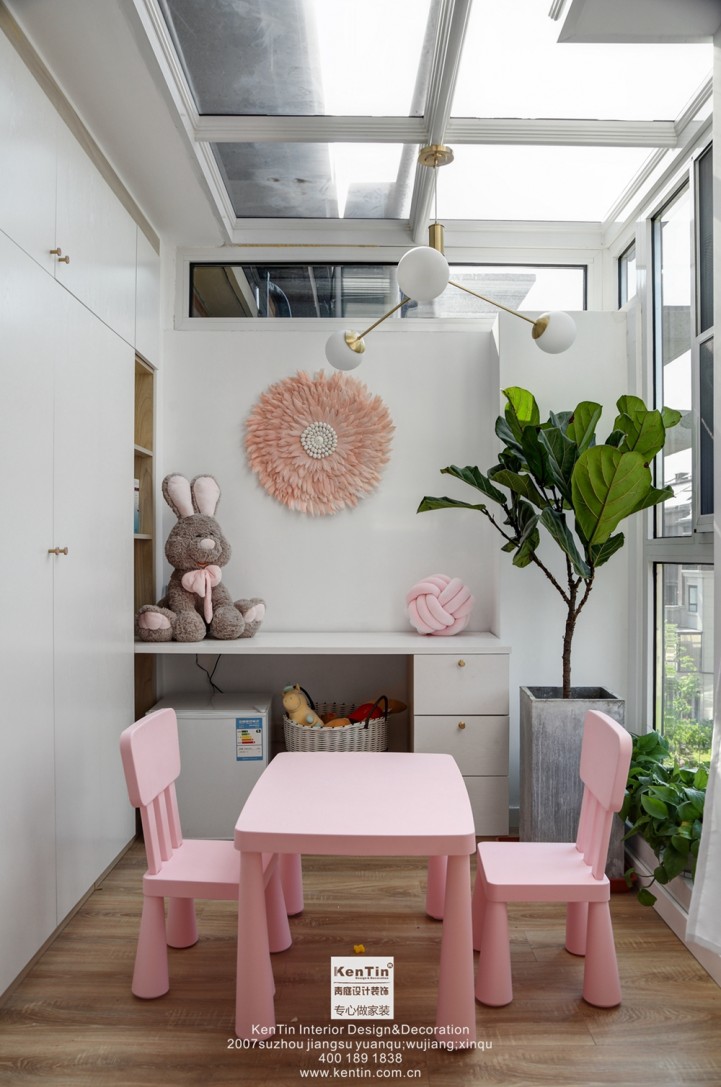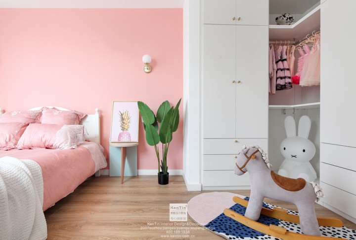 兒童房每個元素都有著濃郁的公主味。屋主有一對可愛的雙胞胎,除了用粉色滿足小公主的夢想之外,還劃分了玩樂區域,小公主們的日常行動得到了滿足。