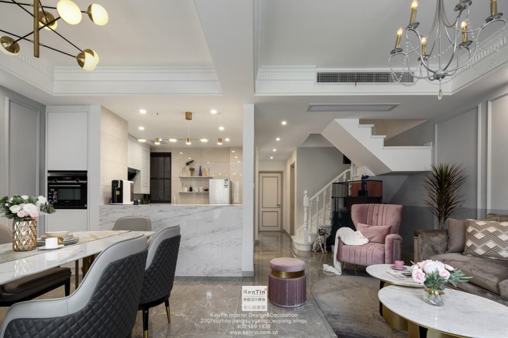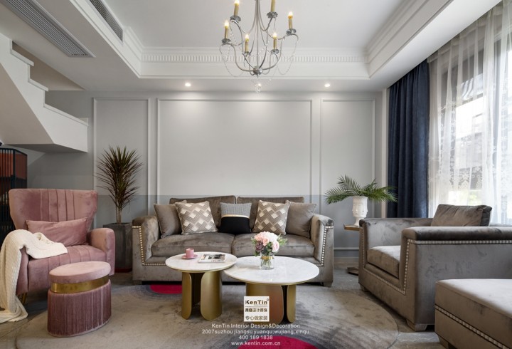 客廳背景墻和吊頂的線條感將整個空間的格局強烈劃分,軟裝色彩跳躍又柔和,材質是絨布沙發與金屬感較強的包邊結合,既顯露出濃濃的浪漫主義色彩又不失穩重。