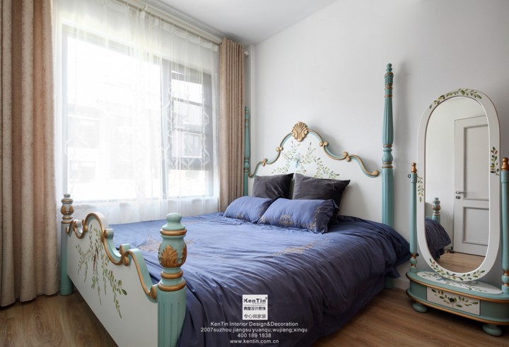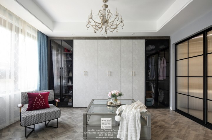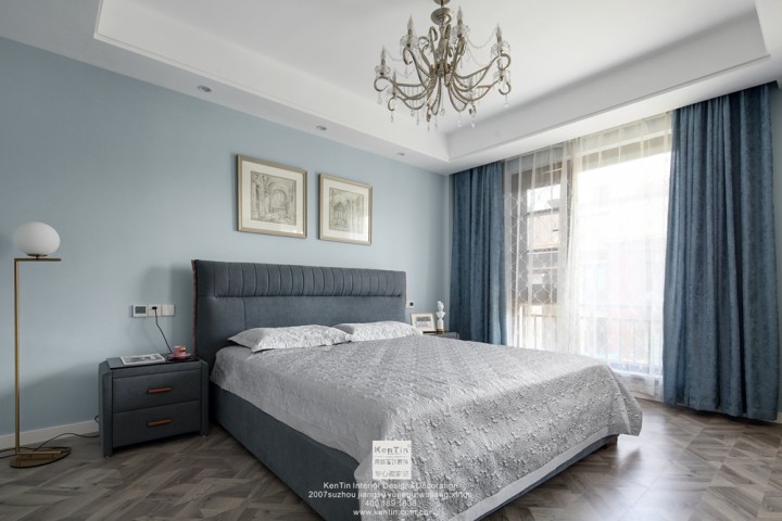 主臥墻面色彩淡藍色,與床、窗簾等呼應起來,并無過多的裝飾物。而考慮到衣帽間的實用性,其儲物空間也大大增加。