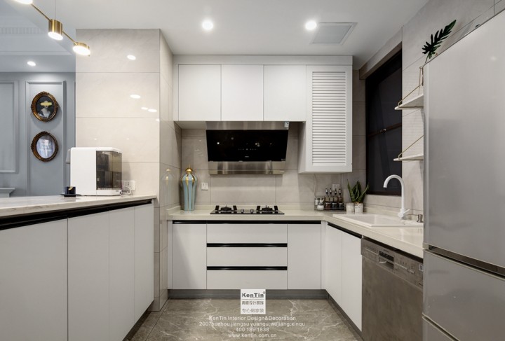 屋主希望自己的房子采光充足,明亮、實用、個性。考慮到這些因素,白色元素是一樓墻面和櫥柜最多運用的色彩。簡單,時尚,清爽,自由。