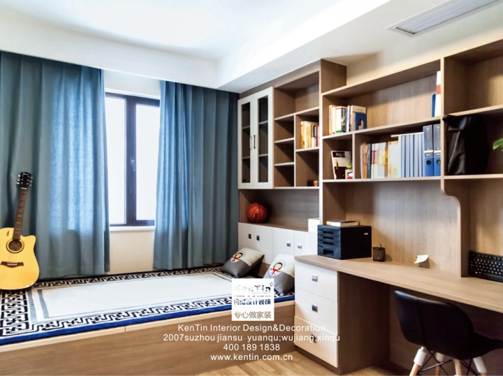 L字形的書柜榻榻米合理的利用空間,原木的書桌書柜簡單內斂,隨意擺放的吉他、籃球和抱枕又有幾分的溫馨俏皮。