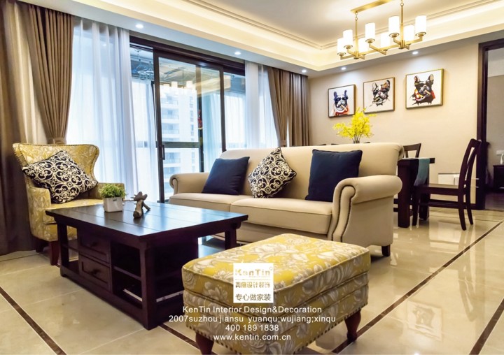 布藝沙發和實木家具是簡美風格的一貫追求,簡約大氣,花色的沙發溫馨之余帶有一絲俏皮,落地窗的設計保證了良好的采光度,簡潔明亮。客餐廳一體的設計,寬敞明亮,協調的顏色更顯空間感和整體感。