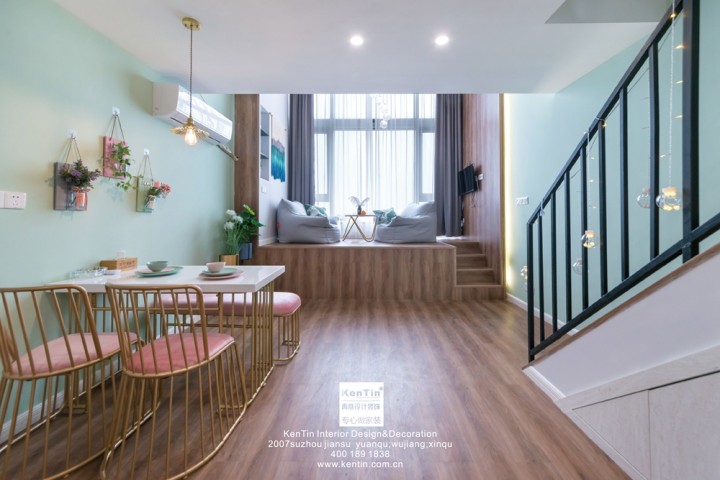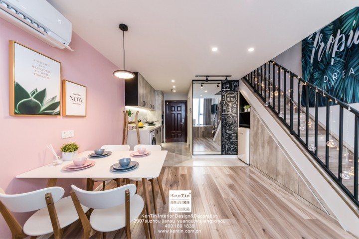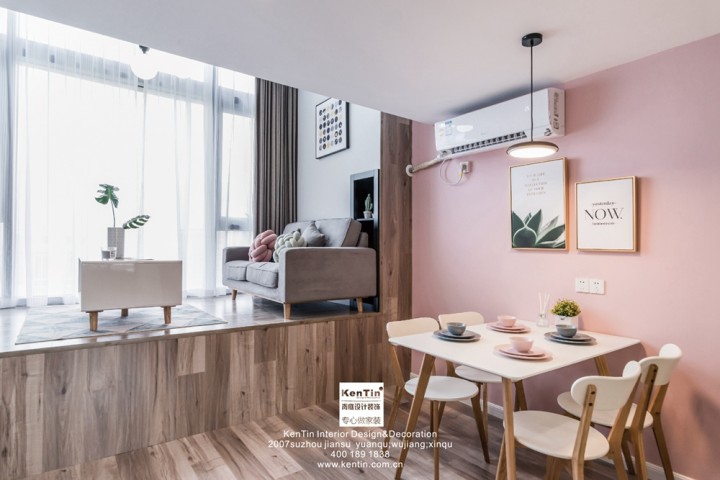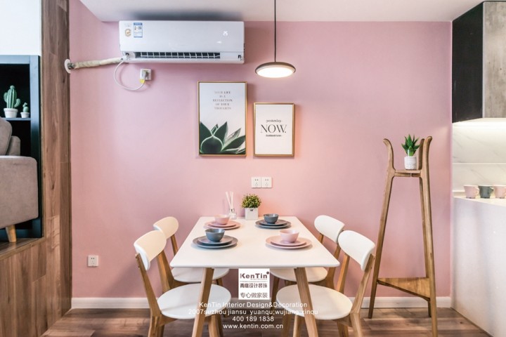 暖色的吊燈,粉色的墻壁,純色的桌面,馬卡龍色的碗碟,一切都是溫暖的存在。墻壁上精致的壁畫在溫暖之外增添了格調。