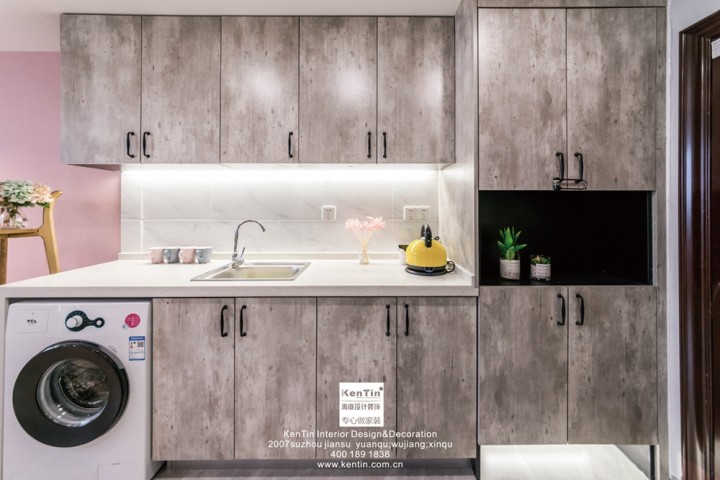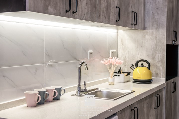 橫與豎的線條撐起了整個廚房,簡單的線條拉伸了視野區域,無形中增加了空間感,極淺的色彩讓整個空間明快,黃色的鍋具與馬卡龍色的杯子、綠色的多肉又讓視線有了聚焦點,使整個空間多了幾分居家氣息。
