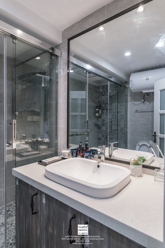 透明的推拉門拉伸了空間,厚實的白色門框與洗手臺與淺色柜門、地板相襯,有重有輕,搭配的讓人感覺很舒服??蓯鄣亩嗳獗粩[放在臺盆邊,偶有閑趣,可以澆點水。