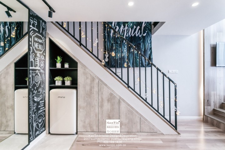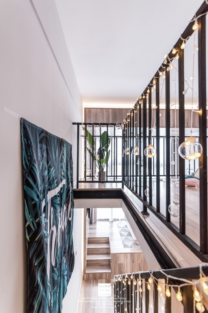 錯落有致的小燈纏繞在黑色的樓梯上,暖黃色的燈光減弱了黑色的冷酷質感,增添幾分柔和。墻壁上掛著極具北歐風情的掛布,點綴在一片白色的世界里,兩側留有余白,如同詩意一樣美。