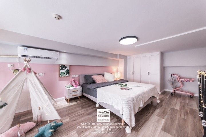 白色打底的空間里,粉色點綴在屋內,毛茸茸的抱枕、迷倒萬千少女的粉紅豹、造型簡單的手推車,滿滿的少女心。墻上的植物壁畫與床上隨意擺放的綠植相照應,自然感十足。