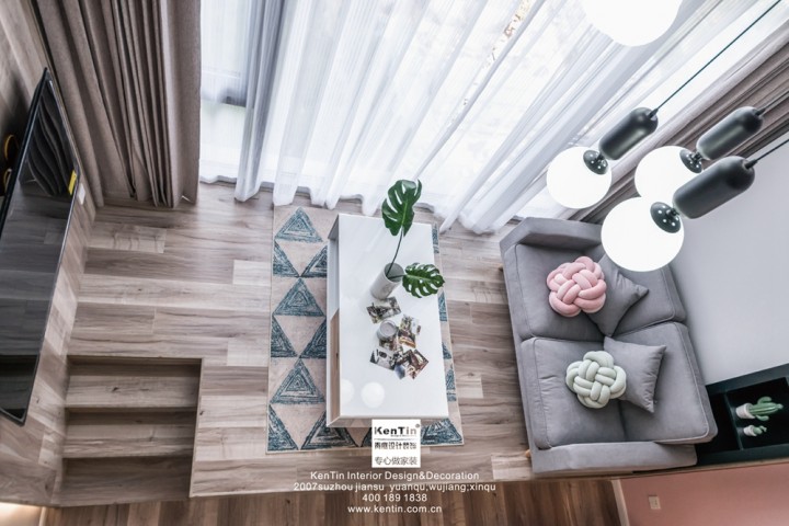 在這里,仿佛來到了木頭的世界,淺色的木板將墻壁與地面融為一體,造型獨特的抱枕和綠植又增添了幾分生機。純色的窗簾、沙發與桌子使得整個空間干凈簡潔,讓屋主可以呆在這里放松小憩。