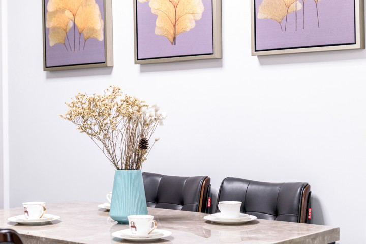 餐廳沿用白色主基調(diào),自然而然與客廳連成一體,不顯突兀。皮質(zhì)餐椅,非常顯質(zhì)感。墻上的掛畫則凸顯出餐廳的功能劃分,設(shè)計(jì)新穎別致。桌面擺放的花束與掛畫、桌椅相得益彰,使整個(gè)餐廳更具觀感,讓人流連忘返。