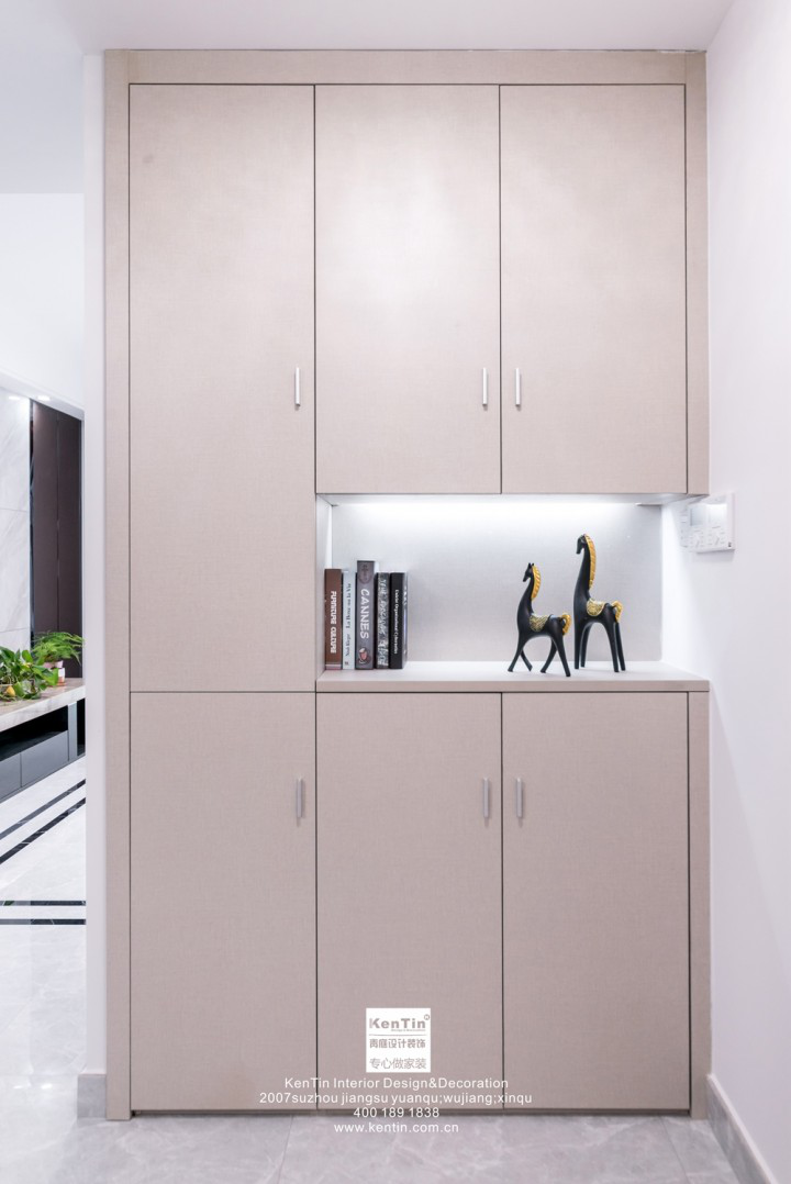 玄關(guān)處墻內(nèi)嵌置柜體,增加儲(chǔ)物的同時(shí)更節(jié)約空間,擺放的書籍與裝飾品,非常耐看,進(jìn)門就能看見如此小巧精致的物件,讓人賞心悅目,忘卻在外的煩惱與憂愁。