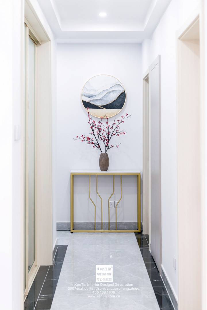 過道也是設(shè)計(jì)不容忽略的一部分。條案上擺放的仿真花,格調(diào)高雅,不禁讓人駐足欣賞,加之簡(jiǎn)易的山水畫,非常有意境,濃濃的中國風(fēng)氣息撲面而來。