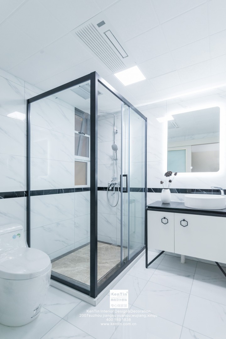 衛(wèi)生間用移門區(qū)分干濕區(qū)域,美觀且節(jié)省空間。透明玻璃設(shè)計(jì),讓人即使身處淋浴空間,視野也不會(huì)受到局限,沒有壓抑感。三出水淋浴柱,適合各種情景下的用水需求,方便自由。依舊使用黑白配的設(shè)計(jì),經(jīng)典大氣。