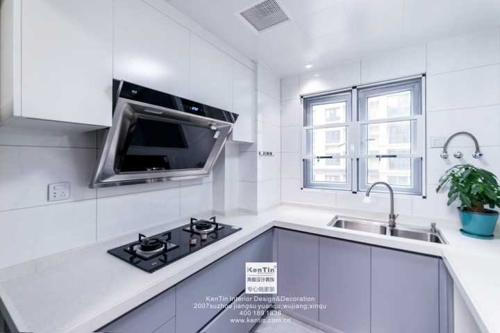 廚房以實(shí)用為主,無過多裝飾。上下儲(chǔ)物柜的設(shè)計(jì)極大地?cái)U(kuò)充了儲(chǔ)物容量,滿足了業(yè)主對(duì)大儲(chǔ)物空間的需求。側(cè)吸式油煙機(jī),方便實(shí)用,讓廚房無油煙。整體設(shè)計(jì)看似簡(jiǎn)約但不簡(jiǎn)單,線條、區(qū)塊的勾勒,桌面的綠植,無不增添了整體的設(shè)計(jì)感。