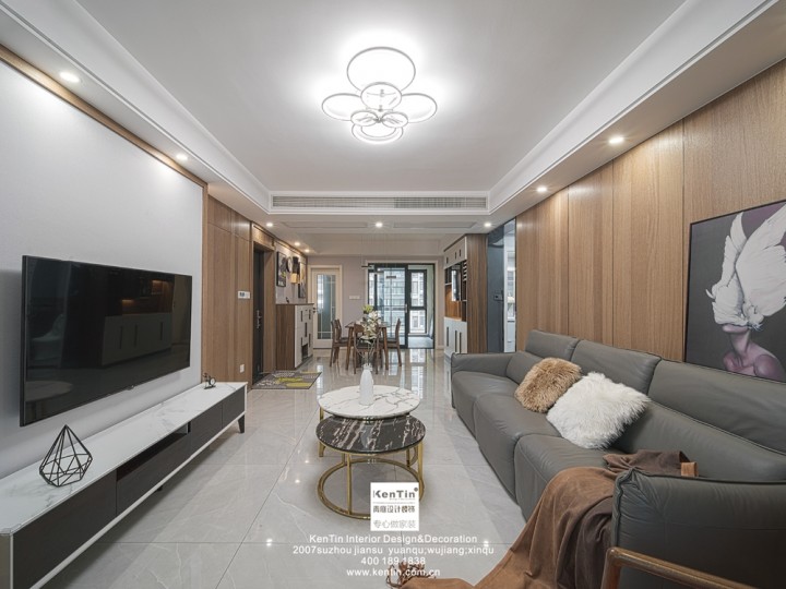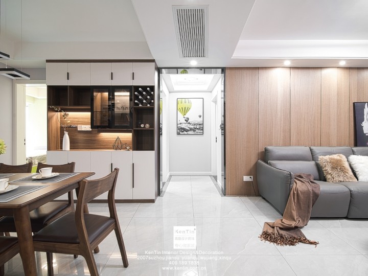 屋主比較偏愛明亮簡潔的感覺,結合房型特點和業主喜好,本案在設計風格上選取現代元素。縱觀整個客餐廳設計,木飾面的使用很有特點,線條感極強,簡單大方。同時也打造了更多的儲物空間。
