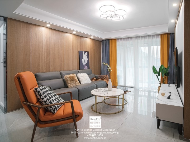客廳布局簡單又不失單調,沙發背景墻的木飾面拉伸了空間感,電視背景墻為木飾面和涂料墻體結合,白色的墻體沖破整體的原木色,與地板呼應。沙發也配備了一個橘色單人椅,提亮空間色彩的同時,與窗簾一致。