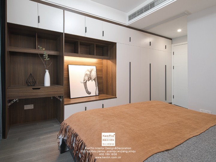 屋主對儲物空間要求很高,因此從主臥入戶門到飄窗處,一整個墻體空間均打造了柜體。視覺上整潔大方之外,也滿足了使用感。