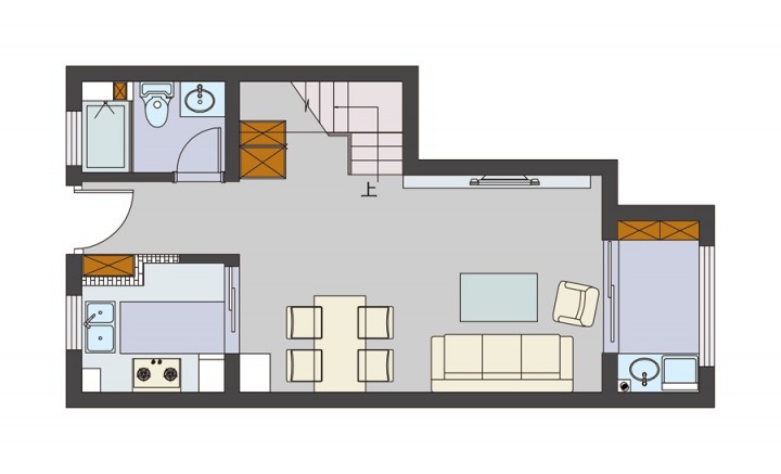 本案為小復(fù)式,一樓主要是客餐廳、衛(wèi)浴等公共區(qū)域,二樓為三個(gè)臥室。