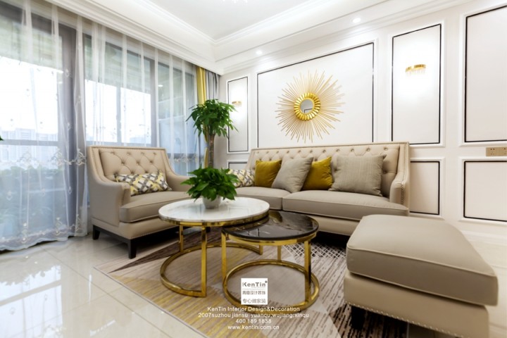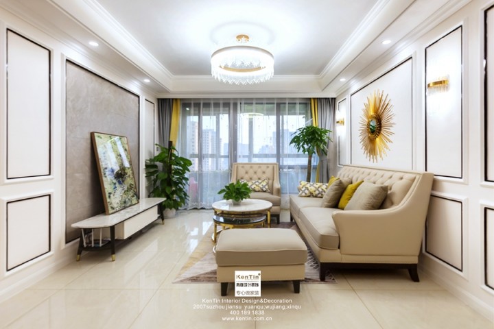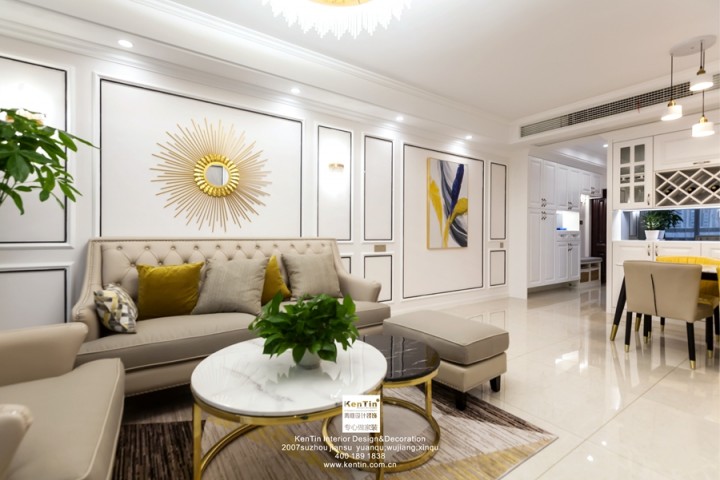 本案風格為歐式輕奢,以溫馨舒適為主。客廳吊頂做了簡單的線條造型,與背景墻上的線條呈現出空間的一致性。整個空間以淺色調為主,再配以暖黃來點綴,提亮空間視覺感。沙發背景墻的裝飾物,茶幾,電視柜的金屬元素將輕奢的品質感著重表達。