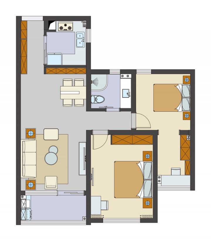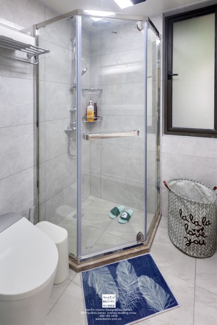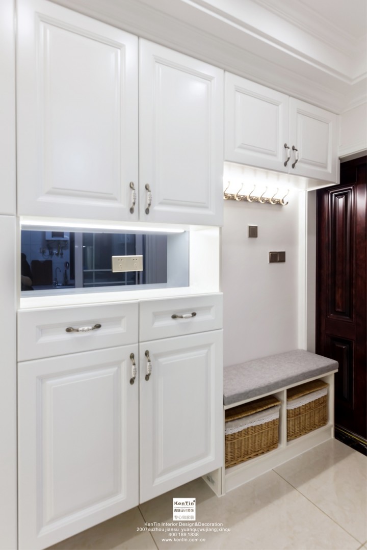 入戶門左側為儲物柜和鞋柜區域,89平的面積被利用到了最大化,空間處理是本案最大的亮點。