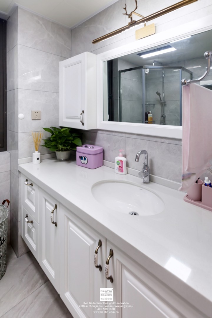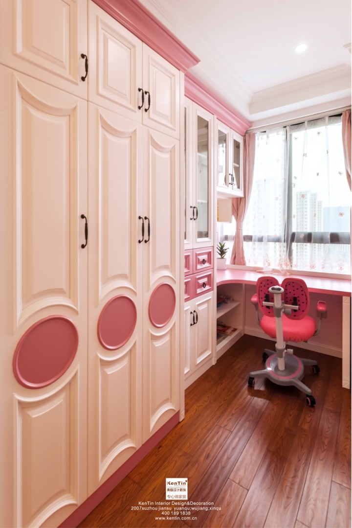 女兒房空間狹長,利用這種縱深感,設置了休憩區、衣帽間、辦公(梳妝)區域。空間整體色彩以粉白為主,溫馨自然。
