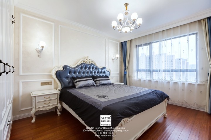 主臥空間溫馨簡單,線條突出空間的縱深感,床品、背景、衣柜、窗簾等元素都是歐式風格的體現,深藍+白色的搭配也可以這么美。