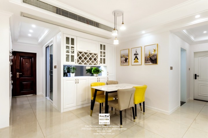 廚房和餐廳過度空間設置了儲物柜和酒柜。餐廳和客廳元素一致,從餐桌椅到裝飾畫,都由暖黃和淺白交替提亮色彩。
