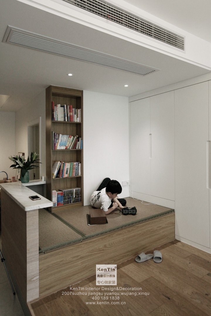【技能get√】考慮到老人偶爾來往,設計師在客廳做了一張榻榻米地臺,睡覺儲物兩不誤,榻榻米上還做了小吧臺,讓整個空間多了一絲趣味。既保持了空間的整體性,同時也讓空間變化富有層次感。