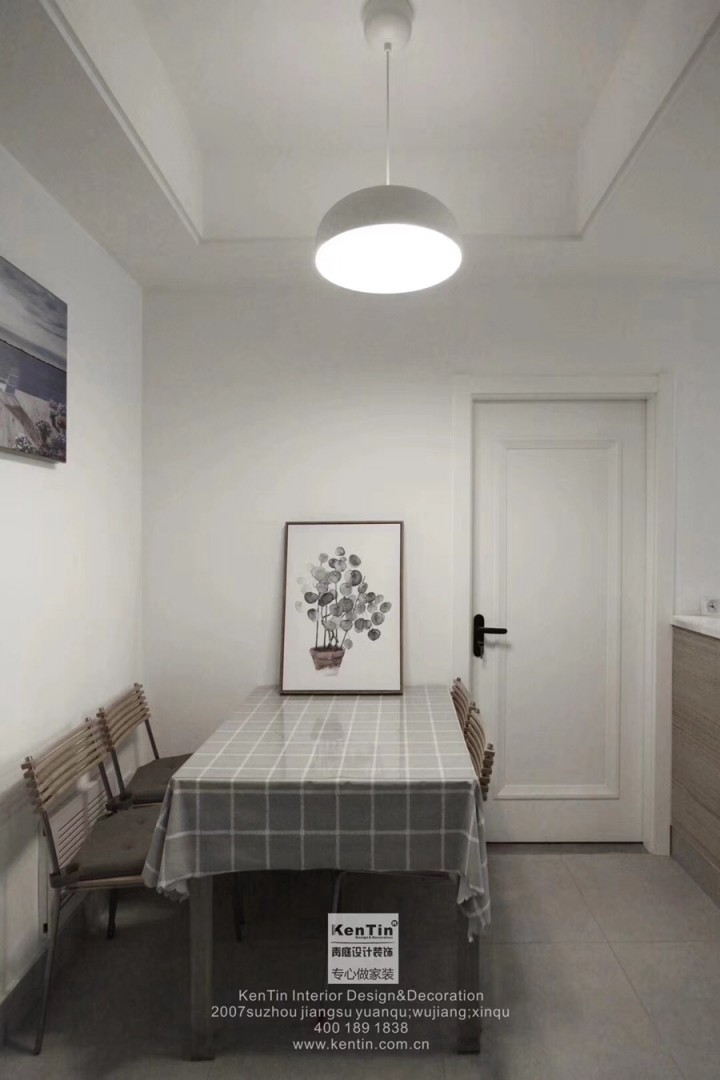 餐廳緊挨著客廳,透露著溫暖舒適的氣質。餐廳上做了吊頂,白色的圓形罩燈將光聚攏于餐桌之上,原本不見光的角落,也因為有了光亮,而顯得格外溫馨。