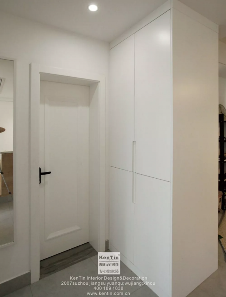 入戶處打了一面玄關柜,進出門時穿換的衣物都可以放在這里,衛生間前也打了一面大大的儲物柜,可以說家里隨處可見儲物空間,非常方便!