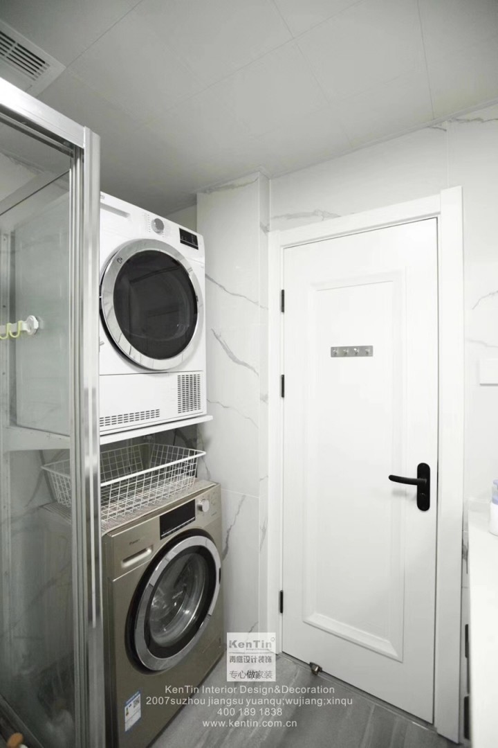 剛剛在陽臺沒有見到的洗衣機和烘干機,被設計師納入了衛生間。烘干機的好處很明顯,時間上,烘干要比晾干快。空間上,晾干需要比較大的地方,而且顯得亂。陽臺這個小戶型必爭之地,僅僅用來晾衣實在是有些可惜了。而且采光通風這么好的地方,省出來做個休閑空間當然更美好。