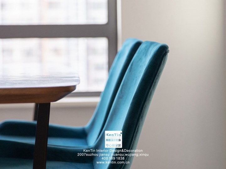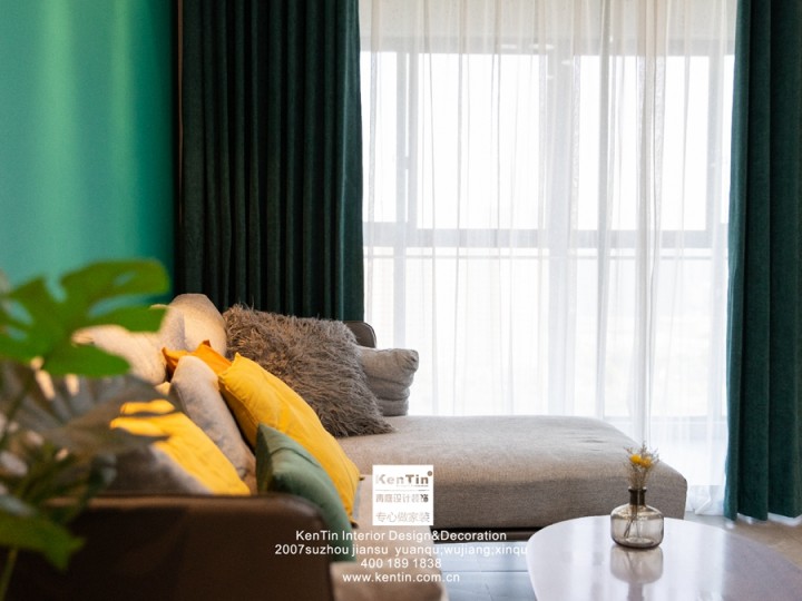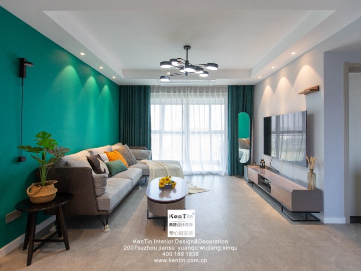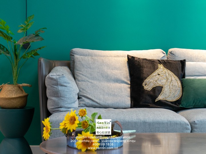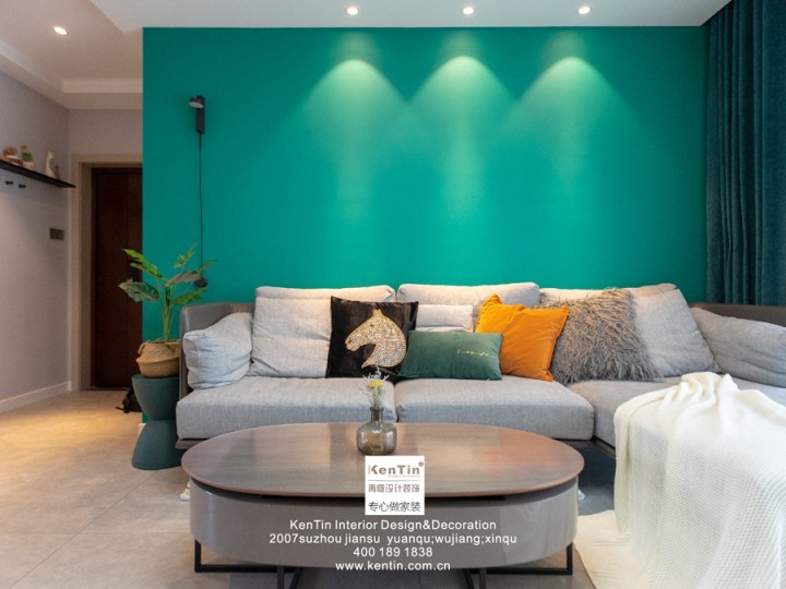沙發(fā)背景墻是客廳的視覺中心。大面積的孔雀藍(lán)可以是海的顏色,也可以是天的色彩,沉靜又明媚,墻前一株綠植,草編的花籃清新文藝,自然氣息十足。