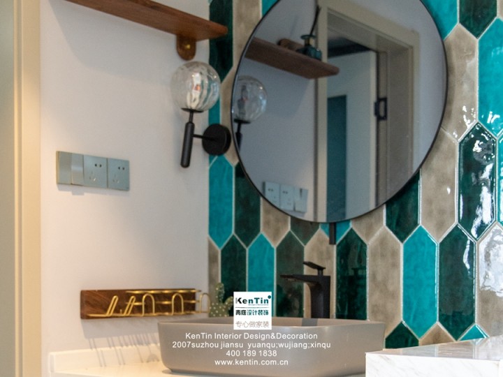 衛(wèi)生間做了干濕分離的設(shè)計(jì)。洗手臺(tái)貼著漂亮的花磚,裝著金色置物架,顏值非常高。