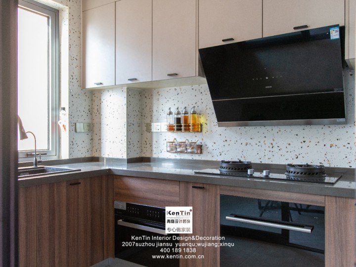 廚房原木櫥柜典雅自然,內(nèi)嵌的廚具不占空間;灰色大理石臺(tái)面干凈易于清理,墻壁上的置物架讓桌面井井有條,騰出更多烹飪空間。